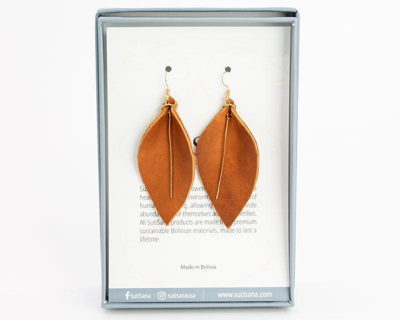 Bold and elegant, the Laurel Leaf earrings catch the eye with a touch of brass and add a statement to any outfit. Handmade by survivors of human trafficking in El Alto, Bolivia. From our Freedom Business Partner, SutiSana, located in Bolivia. Materials: Upcycled vegetable-tanned leather with brass hardware Dimensions: 2 in x 1.5 in.