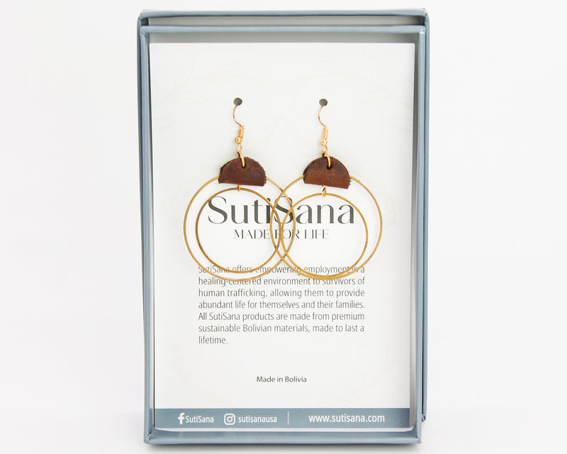 Striking in their simplicity, these handcrafted earrings feature two brass circles suspended beneath an upcycled leather accent. Lightweight and versatile, these earrings pair beautifully with any outfit—from casual daytime wear to elegant evenings out. Handmade by survivors of human trafficking in El Alto, Bolivia. From our Freedom Business Partner, SutiSanalocated in Bolivia. Materials: Silver-coated hyper-allergenic hooks with brass loops and upcycled leather. Dimensions: 2.75 in x 1.75 in.