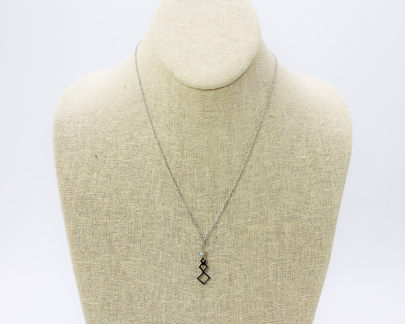 This delicate Muse Necklace has a dainty diamond pendant and a natural Labradorite stone. A very classy piece that is perfect to pair with the Muse Hoops. This piece features wire-wrapping and expert craftsmanship. From our freedom business partner, Purpose Jewelry located in California. Materials: Rhodium. Dimensions: 16 in chain.