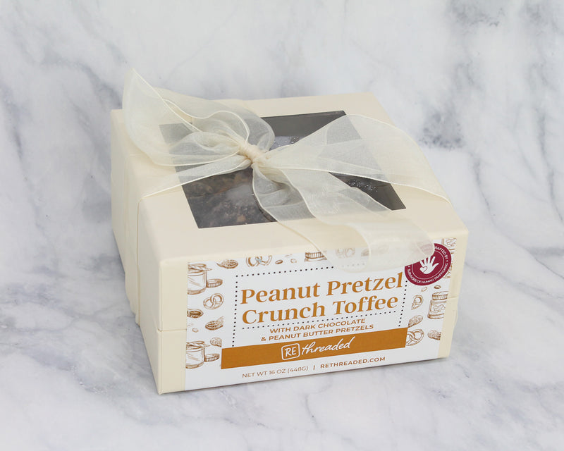Peanut Butter. Chocolate. Enough said? This crowd pleaser starts with buttery toffee and freshly ground peanut butter, coated with decadent, dark chocolate, and topped with crushed peanut butter filled pretzels. This is sure to put a smile on your face. Every time you purchase our toffee you are helping to restore choice and provide impactful work for survivors of human trafficking in Jacksonville, FL. Locally handmade in Jacksonville, Florida, USA. Size: 1 lb. Ingredients: Dark Chocolate Coating Wafers, Butter, Sugar, Enriched Wheat Flour, Peanut Butter, Salt, Malt, Canola Oil. Contains: Milk, Wheat, Peanuts.