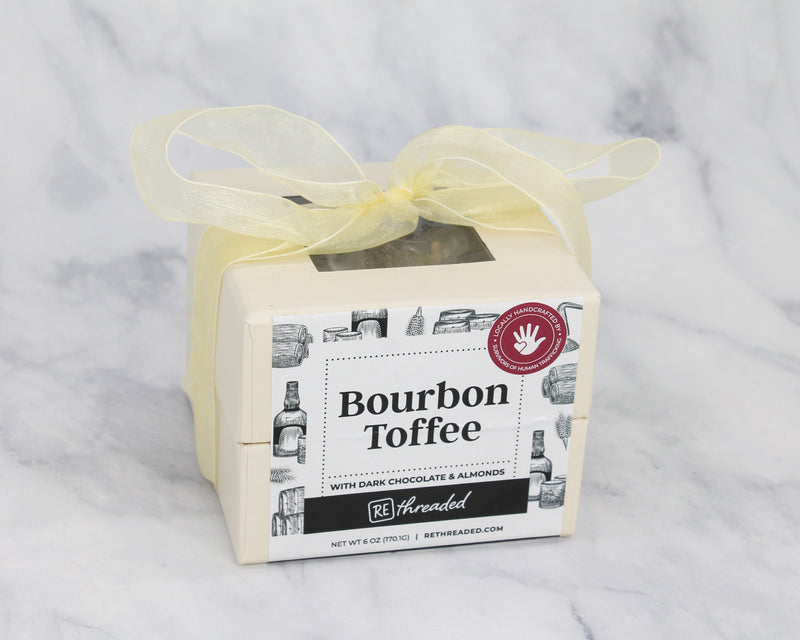 Grab a rocks glass and get ready to indulge in the perfect pairing of toffee and oaky bourbon. We start by combining our famous toffee with delicious bourbon, and then top it with decadent dark chocolate and roasted California almonds, so it's sure to make a perfect nightcap. Every time you purchase our toffee you are helping to restore choice and provide impactful work for survivors of human trafficking in Jacksonville, FL. Locally handmade in Jacksonville, Florida, USA. Size: 6 oz. Ingredients: Dark Chocolate Coating Wafers, Butter, Sugar, Almonds, Bourbon, Oak Extract. Contains: Milk, Almonds.