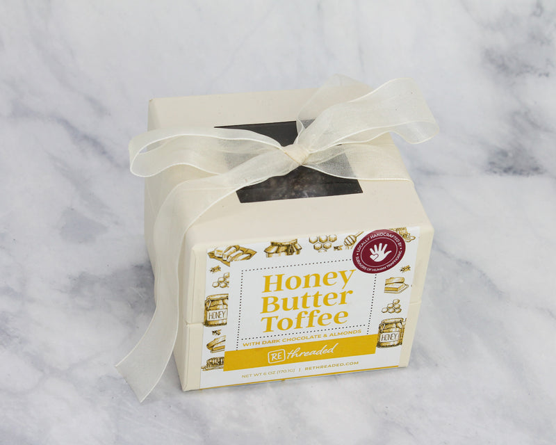 It tastes like biting into a honeycomb. This incredibly luxurious honey butter toffee is made with small batch honey from our partner Bee Love, who creates jobs for previously incarcerated and at-risk individuals in Chicago, IL. Each piece is coated with decadent, dark chocolate, topped with roasted almonds, and finished with sea salt. Every time you purchase our toffee you are helping to restore choice and provide impactful work for survivors of human trafficking in Jacksonville, FL, and across the country. Locally handmade in Jacksonville, Florida, USA. Size: 6 oz. Ingredients: Dark Chocolate Coating Wafers, Butter, Sugar, Almonds, Honey. Contains: Milk, Almonds.