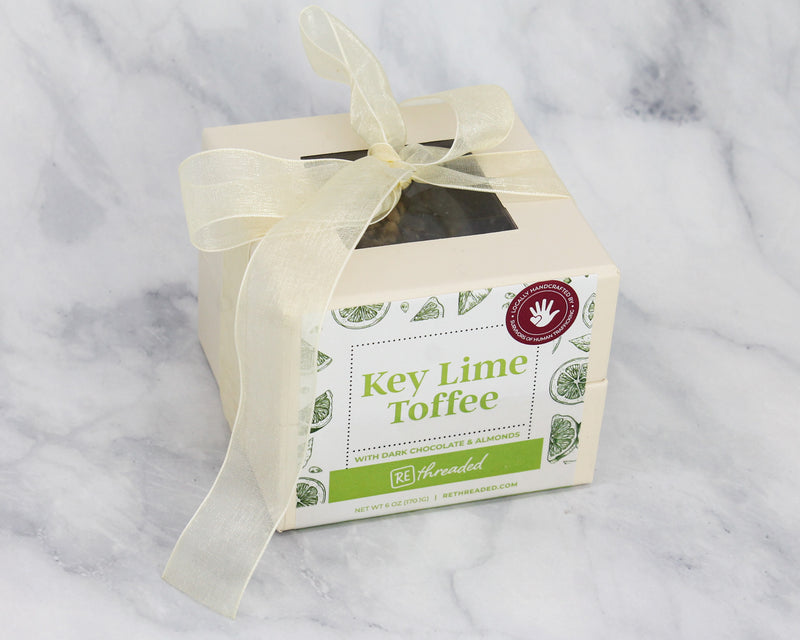 Enjoy paradise in a bite. After all, no Florida vacation is complete without key lime treats. We took our famous toffee and infused it with delicious key lime, coated it in decadent, dark chocolate, topped it with roasted almonds, and finished it with a touch of sea salt. Every time you purchase our toffee you are helping to restore choice and provide impactful work for survivors of human trafficking in Jacksonville, FL. Locally handmade in Jacksonville, Florida, USA. Size: 6 oz. Ingredients: Dark Chocolate Coating Wafers, Butter, Sugar, Almonds, Key Lime Pie Liqueur, Key Lime Extract. Contains: Milk, Almonds.