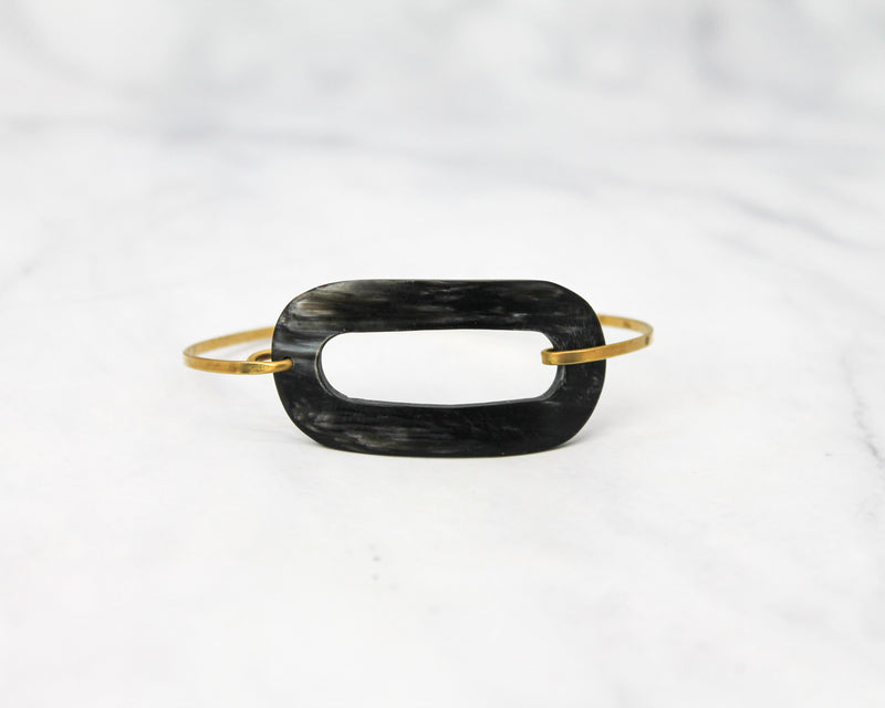 This sleek, modern cuff-style bangle has tension closure for easy wearing. It's made from recycled Ankole horn sourced locally in Uganda, and paired with a sleek wire bangle handmade by artisans in Purpose Jewelry’s Kampala sanctuary. Keep the brass polished for an elegant look, or let it patina for an earthy vibe. This piece celebrates traditional local materials and the natural beauty of the recycled horn. From our freedom business partner, Purpose Jewelry, located in California. Materials: Ankole horn and brass. Dimensions: 2.5 in diameter.