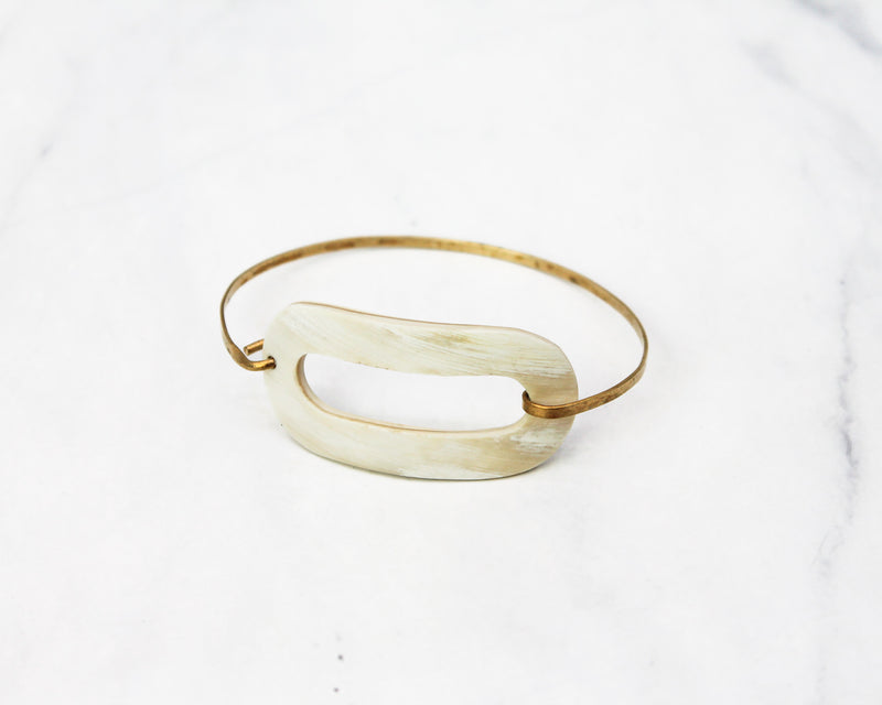 This sleek, modern cuff-style bangle has tension closure for easy wearing. It's made from recycled Ankole horn sourced locally in Uganda, and paired with a sleek wire bangle handmade by artisans in Purpose Jewelry’s Kampala sanctuary. Keep the brass polished for an elegant look, or let it patina for an earthy vibe. This piece celebrates traditional local materials and the natural beauty of the recycled horn. From our freedom business partner, Purpose Jewelry, located in California. Materials: Ankole horn and brass. Dimensions: 2.5 in diameter.