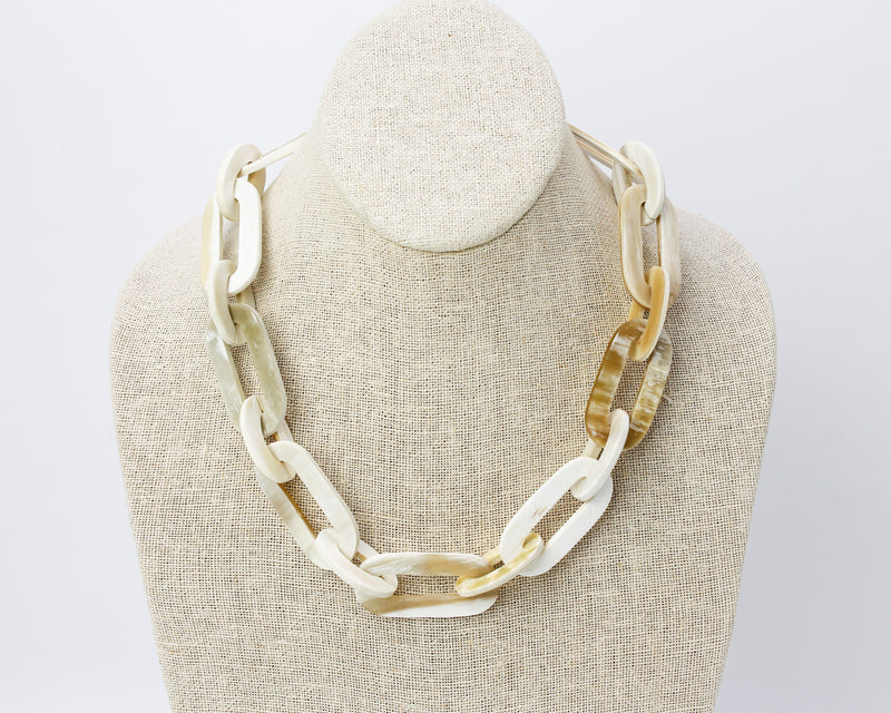 This long Ankole Chain Link Necklace is unique. It's an artisanal piece you can enjoy for years to come and perfect as the oversized chain trend shows no signs of slowing down. Handcrafted from recycled horn in Kampala, Uganda, this piece showcases the beauty of a local, natural material and supports artisans in the local economy as well as in our workshop. The chain closure makes this piece more wearable with no bulky chain at the back of your neck, and the lightweight nature of Ankole means you can comfortably wear this piece all day. From our freedom business partner, Purpose Jewelry, located in California. Materials: Ankole horn and brass. Dimensions: 19 in drop.