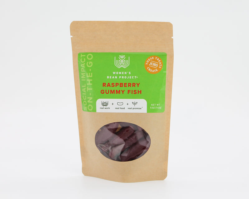 A sweet and chewy snack that supports women facing chronic unemployment. These Raspberry Gummy Fish from the Women’s Bean Project are the perfect treat. The resealable and recyclable bags make it easy to enjoy a handful at a time. The gummies are gluten-free recipe and made with no artificial flavors or preservatives to ensure only the best for your movie snack or ice cream topping. From our Freedom Business Partner, The Women’s Bean Project, located in Denver, Colorado. Please note that this product is manufactured on shared equipment with milk, peanuts, soy, tree nuts, wheat.