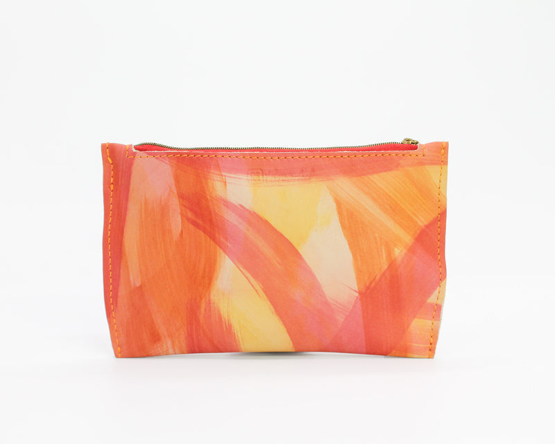 Perfect for all your organizational needs, Rethreaded’s Zip Pouch makes a great makeup bag, pencil pouch, or storage for all those small items that end up rattling around the bottom of your bag. Featuring a unique vibrant hand painting technique. Every time you purchase our Zip Pouch you are helping to provide 40 minutes of employment and supportive services for a survivor of human trafficking at Rethreaded. Made with upcycled leather. Locally handmade in Jacksonville, Florida, USA. Dimensions: 8 in x 5 in.