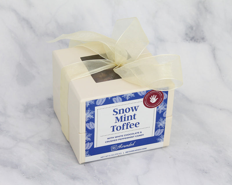 Welcome the holiday spirit with this buttery toffee topped with a thin layer of white chocolate and lovingly sprinkled with crushed peppermint candy canes. We’ve heard Santa himself chooses this toffee to pair with his hot chocolate. And the best part is, every time you purchase our toffee you are helping to restore choice and provide impactful work for survivors of human trafficking in Jacksonville, FL. Locally handmade in Jacksonville, Florida, USA. Size: 6 oz. Ingredients: White Chocolate Melting Wafers, Crushed Peppermint Candy, Butter, Sugar, Almonds, Vanilla Extract. Contains: Milk, Almonds, Soy.
