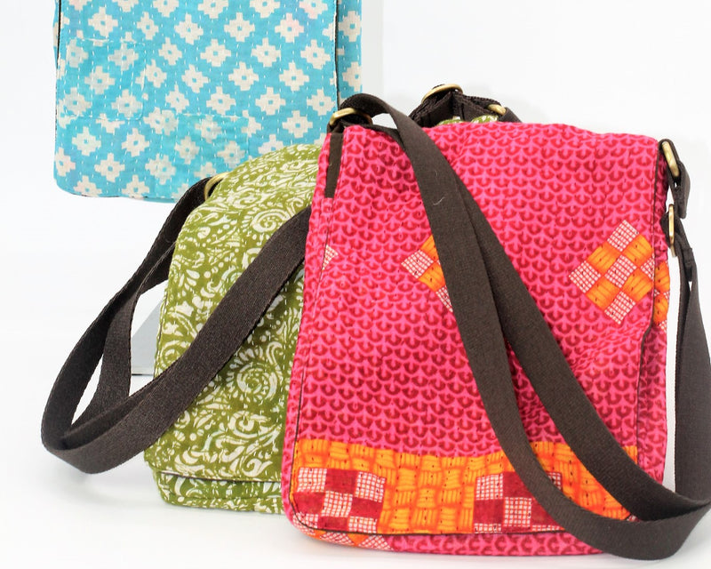 Style and functionality made into the perfect mini crossbody for every day. The Mini Meye Messenger has room for your tablet, keys, phone, and more. Includes a gusseted front pocket to keep you organized and an interior zipper pocket to keep your items secure. The Meye Mini is a go-to for traveling light without sacrificing comfort, convenience, or style. From our freedom business partner, Sari Bari located in Kolkata, India. Handmade with 100% cotton sari and canvas-lined interior for structure and durability. Dimensions 10 in x 8inx 1.5 in. Features an adjustable crossbody strap two interior gusset pockets to keep you organized, zipper closure, and signed by the artisan. Note: your order will come in a variety of colors and patterns. If you have a preference, you can reach out to us at info@rethreaded.com use the chat function, or leave us a note on your order.