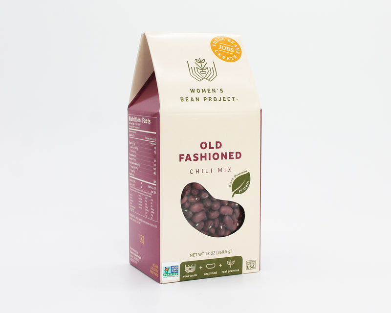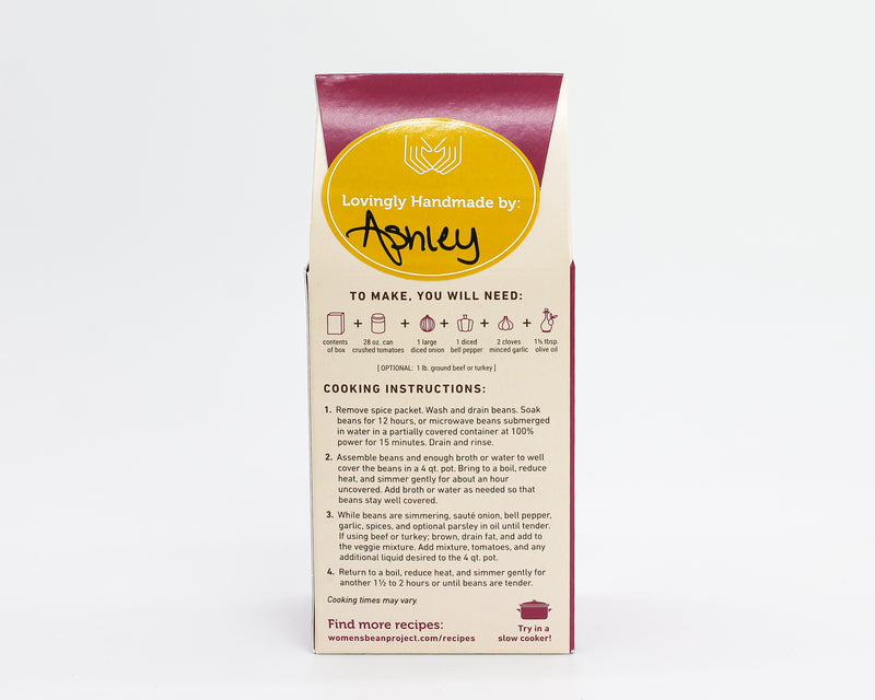 Warm up with a nice bowl of hot chili that supports women facing chronic unemployment. The Old Fashioned Chili Mix by The Women’s Bean Project is made with a variety of mild spices and sweet red chili beans for a rich and hearty meal. The soup is non-GMO, certified Kosher, and vegan to ensure that only the best ingredients are served around the table. From our Freedom Business Partner, The Women’s Bean Project, located in Denver, Colorado. Mix includes small red chili beans, spices (cumin, chili powder, parsley), and salt.