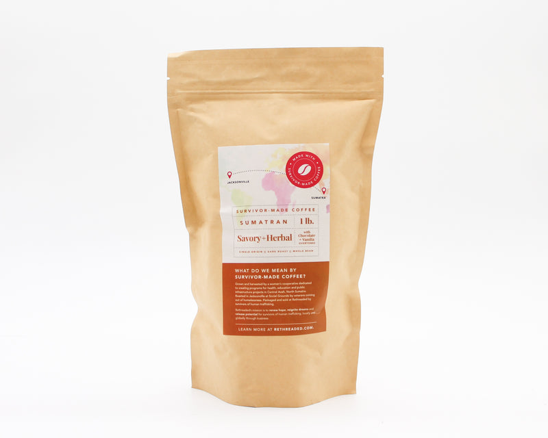This delicious coffee is grown and harvested in Sumatra by survivors. The beans are then roasted in Jacksonville at Social Grounds by veterans coming out of homelessness. Every time you purchase Coffee you are helping to restore choice and provide impactful work for survivors of human trafficking in Jacksonville, FL, and around the world. Savory and herbal with chocolate and vanilla overtones. Single-origin dark roast whole bean coffee. Size: 1 lb