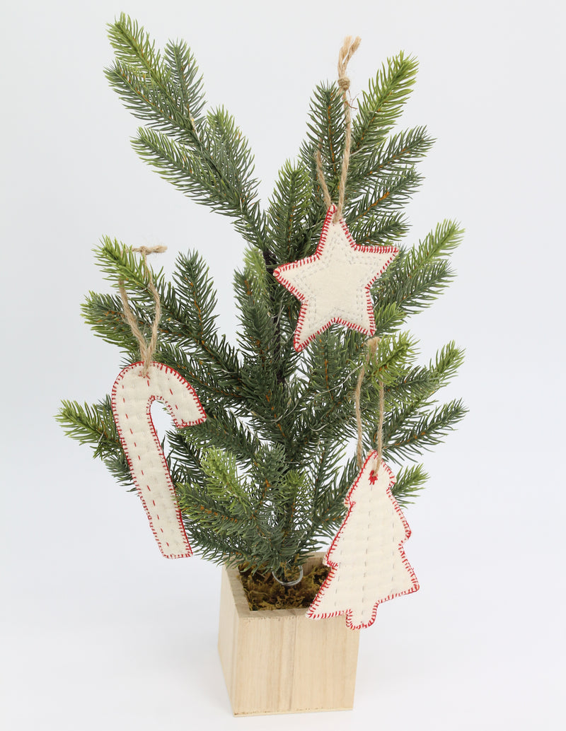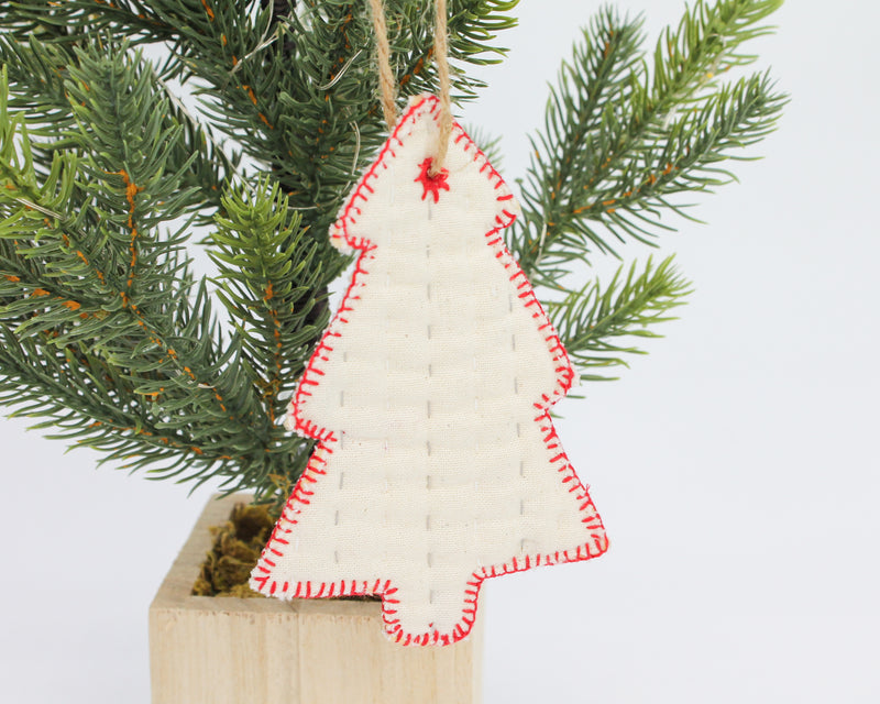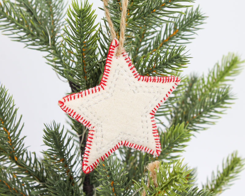Cozy up your home with these charming hand-quilted holiday ornaments. Made from vintage cotton and intricate stitching techniques, these ornaments are sure to become a household favorite. Each ornament symbolizes hope for the holidays for survivors reclaiming their lives. From our freedom business partner, Basha, based in Bangladesh. If interested in a particular design you can customize your order by messaging us in the chat function, leaving a note on your order, or emailing us at info@rethreaded.com. Material: cotton. Dimensions: Tree 4.7in tall, Star 2.6in by 3.3in, Candy Cane 4.5in.