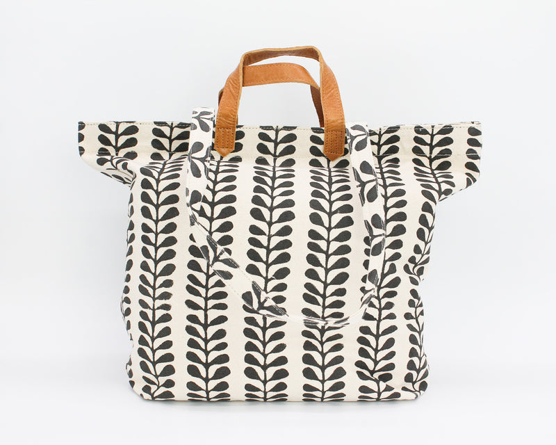 This elevated everyday tote with generous amounts of room to effortlessly carry all your daily essentials is perfectly practical. With two ways to wear; carry by hand using the recycled leather straps or over the shoulder thanks to the comfortable, canvas straps. Featuring Joyns’ signature hand block printing on hand-woven cotton canvas. From our freedom business partner, Joyn Bags, based in Siloam Springs, Arkansas. Materials: cotton canvas with recycled leather straps. Dimensions: 20in x 15in. Leather handle drop 5 in, Canvas handle drop 14in.