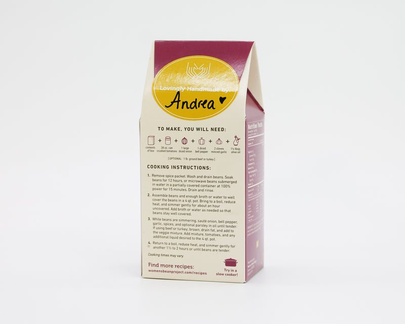 Warm up with a nice bowl of hot chili that supports women facing chronic unemployment. The Firehouse No. 10 Chili Mix by The Women’s Bean Project is made with a variety of spices and beans for a rich and hearty meal. The soup is non-GMO, certified Kosher, and vegan to ensure that only the best ingredients are served around the table. From our Freedom Business Partner, The Women’s Bean Project, located in Denver, Colorado. Mix includes light red kidney beans, pinto beans, small red chili beans, spices (chipotle, chili powder, cumin, parsley, crushed red peppers), and salt.