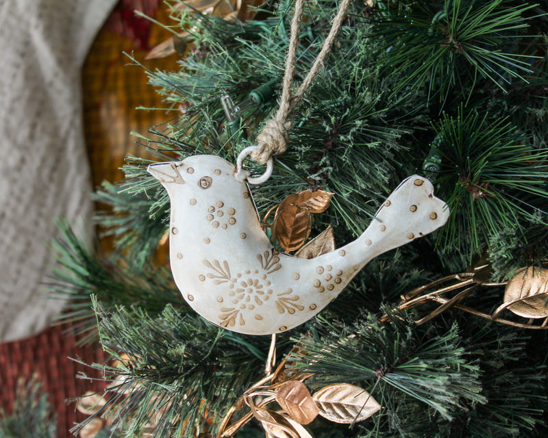 This decorative metal bird ornament features stamped floral and dot detailing across its wings and body, with a rustic whitewashed finish. It includes a natural jute twine loop for hanging and a small metal ring attachment. Lightweight and versatile,it’s perfect for adding a handcrafted touch to your home decor.Every time you purchase the Ornate Angel you are helping to restore choice and provide impactful work for survivors of human trafficking in Southeast Asia. This product is from our Freedom Business Partner, Rahab’s Rope, located in Gainesville, Georgia.Dimensions: 7" L x 5.5" W