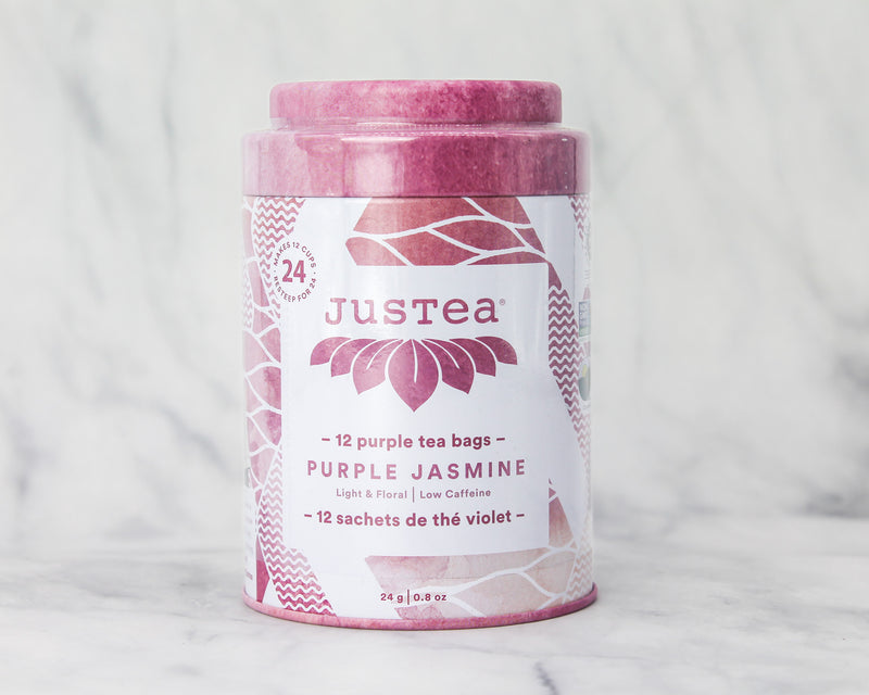 A cup of Purple Jasmine is fresh and delicate. The enchanting fragrance of real jasmine blossoms creates the perfect pairing of tea and flowers. Full of Purple Tea super-antioxidant health benefits. Ingredients: Jasmine Green Tea, Kenyan Purple Tea, Jasmine Blossoms, Cornflower Blossoms. Low Caffeine. Contains twelve purple tea bags for twelve cups or twenty four resteeps. Hand-picked in Kenya. From our freedom business partner, Justea located in Vancouver, British Columbia.