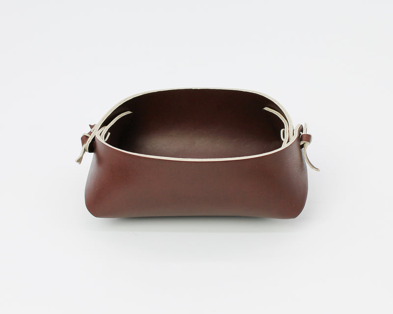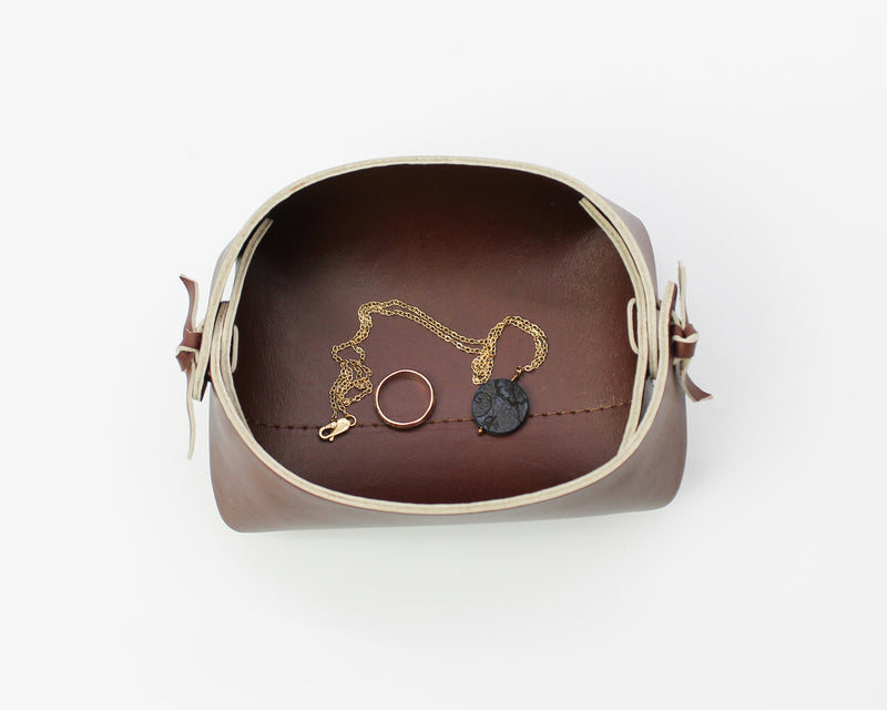Toss your keys and wallet in a place that’s stylish and convenient each time you use the Small Valet Tray from Rethreaded. This tray will look beautiful on your countertop, your entryway table, or your coffee table. Its design turns the items you haphazardly toss onto the counter into an organized collection stored in a statement piece. Every time you purchase our Small Valet Tray you are helping to provide meaningful employment and supportive services for a survivor of human trafficking at Rethreaded. Made with upcycled leather. Locally handmade in Jacksonville, Florida, USA. Dimensions: measures approx. 4" x 5 ½" x 2 ½" Please note, product is not food safe.