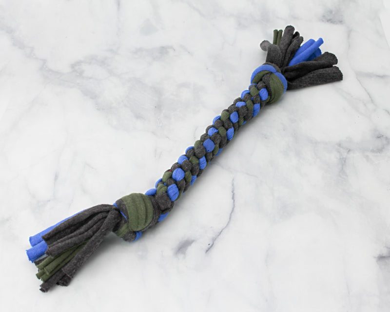 Your dog's new best friend, besides you of course! The Tee-Bone Dog Toy comes in four different sizes, is sturdily made, and has many different color combos. Every time you purchase our Tee Bone toy you are helping to restore choice and provide impactful work for survivors of human trafficking in Jacksonville, FL. Made with upcycled t-shirts. Good for the environment. Locally handmade in Jacksonville, Florida, USA. Machine Washable & Dryer Safe. Dimensions: 9 in length