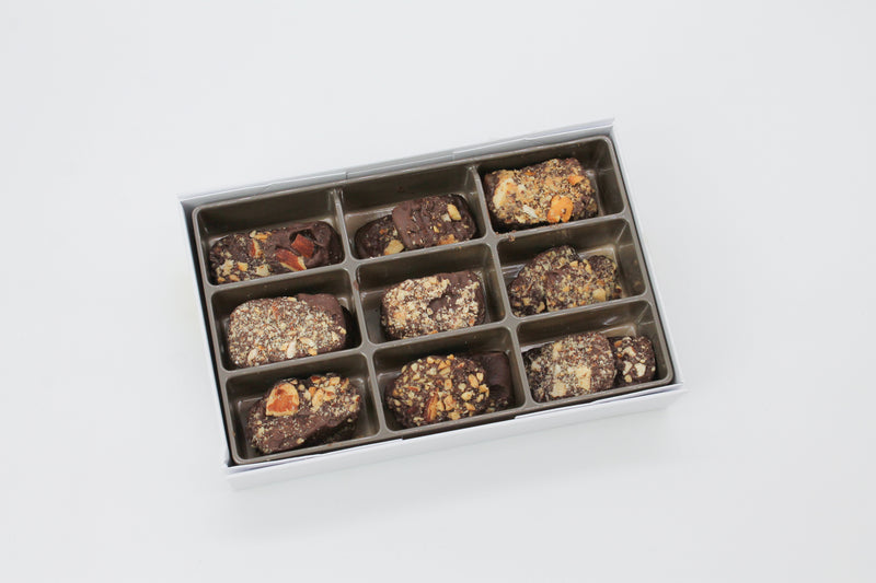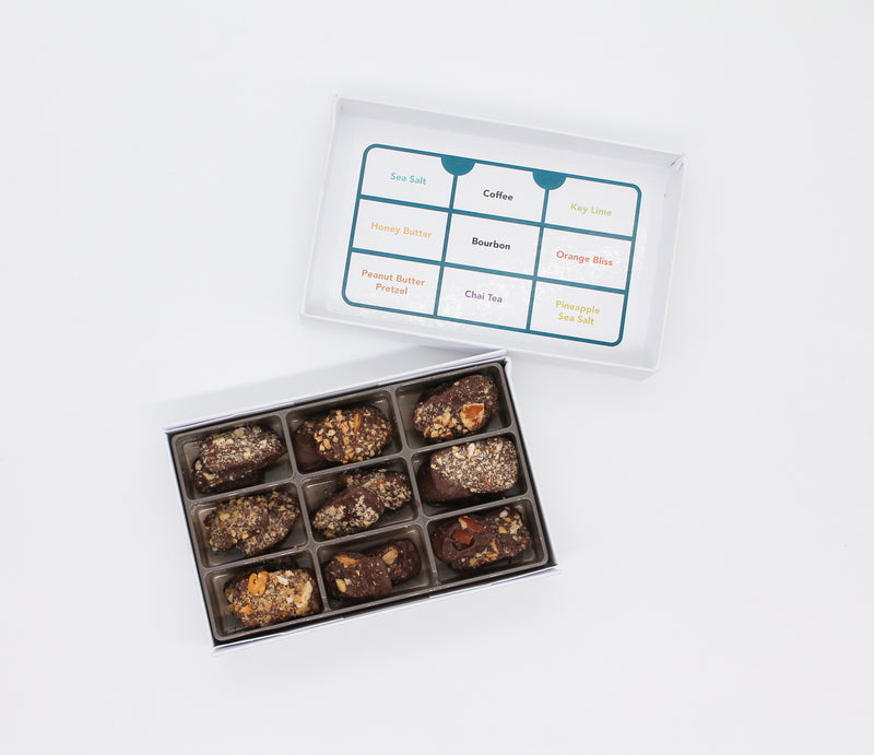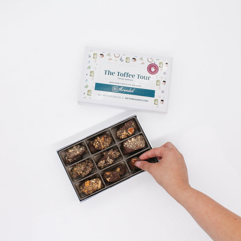 Take a complete tour of all the flavors of our delicious toffee. Sampler: Contains 1 oz each of Sea Salt, Peanut Pretzel, Honey Butter, Coffee, Bourbon, Chai Tea, Key Lime, Orange Bliss and Pineapple Sea Salt toffee. Each piece is coated with decadent dark chocolate, topped with fresh roasted California almonds, and finished with sea salt. Every time you purchase our toffee you are helping to restore choice and provide impactful work for survivors of human trafficking in Jacksonville, FL. Locally handmade in Jacksonville, Florida, USA. Size: 9 oz. Ingredients: Dark Chocolate Coating Wafers, Butter, Sugar, Almonds. Contains: Milk, Almonds.